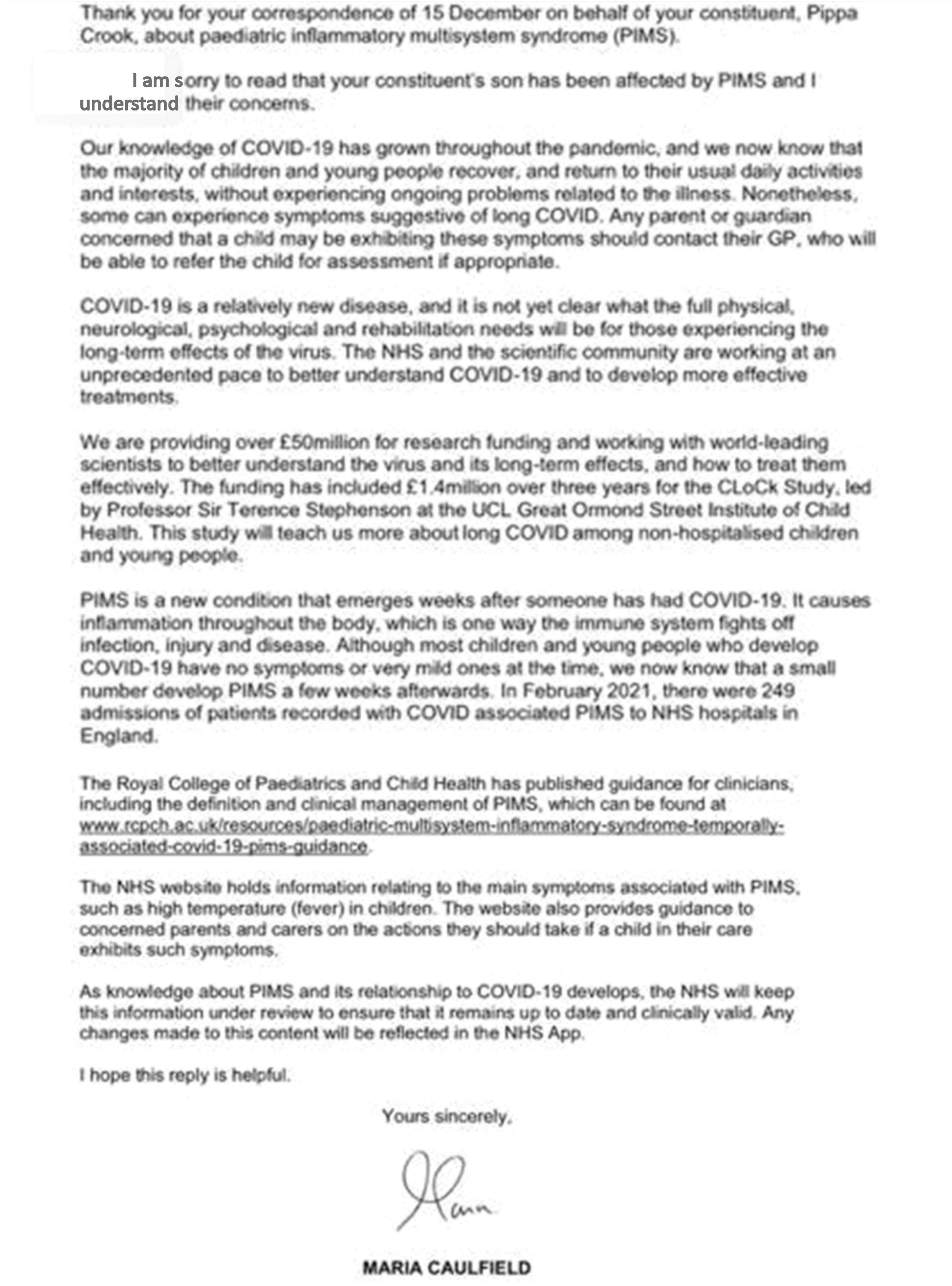Letter 3. Multiple identical replies were received by group members from Maria Caulfield of the DHSC again mostly with reference to Long COVID, and inaccuracies in reference to PIMS-TS.