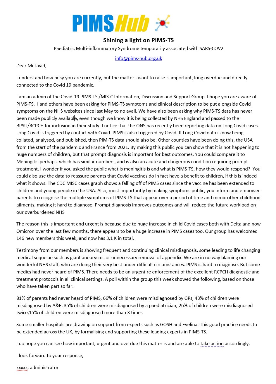 Letter 1. Letter written to Sajid Javid by a group admin asking for awareness and data for PIMS.