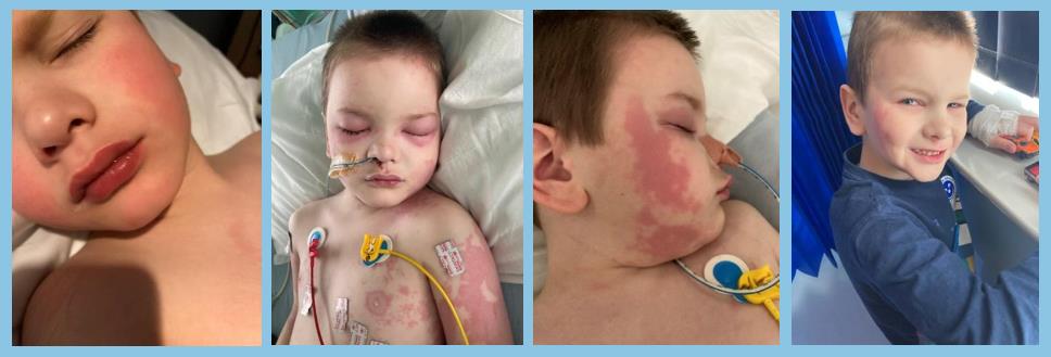 By Day 3, the rash had spread across Oliver’s body and his temperature couldn’t be kept down with paracetamol. An ultrasound showed inflammation around his stomach and gall bladder. The doctors settled on Kawasaki Disease and started treatment of immunoglobulin. However, that night Oliver’s blood pressure dropped significantly and he was transferred by ambulance to the Evelina Paediatric Intensive Care Unit. By Day 4, the inflammation markers in Oliver’s blood reached 338 (they should be less than 10), the rash continued to spread, his temperature passed 40 and he developed swelling to his face. At this point the consultants called Oliver a ‘diagnostic conundrum’. They were considering Kawasaki disease, PIMS, sepsis and autoimmune diseases, but Oliver didn’t fit the criteria for one particular condition and the immunoglobulin hadn’t worked.